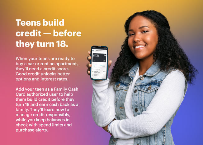 Following the launch of the Family Cash Card, we needed to create a separate, but related introduction to the offering of Teen Credit — where teens are able to be added as an authorized user to their parent's Family Cash Card and enabling them to start building credit before they turn 18.