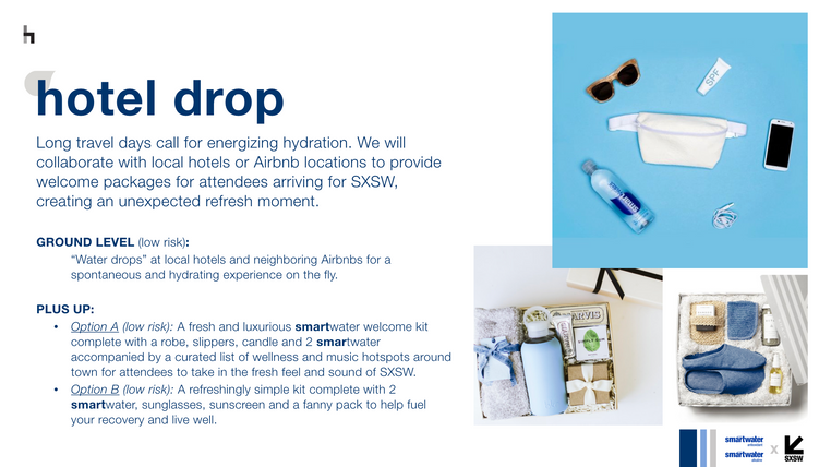Concept pitch deck for Smartwater SXSW activation to launch the new line of smartwater alkaline and smartwater antioxidant.
